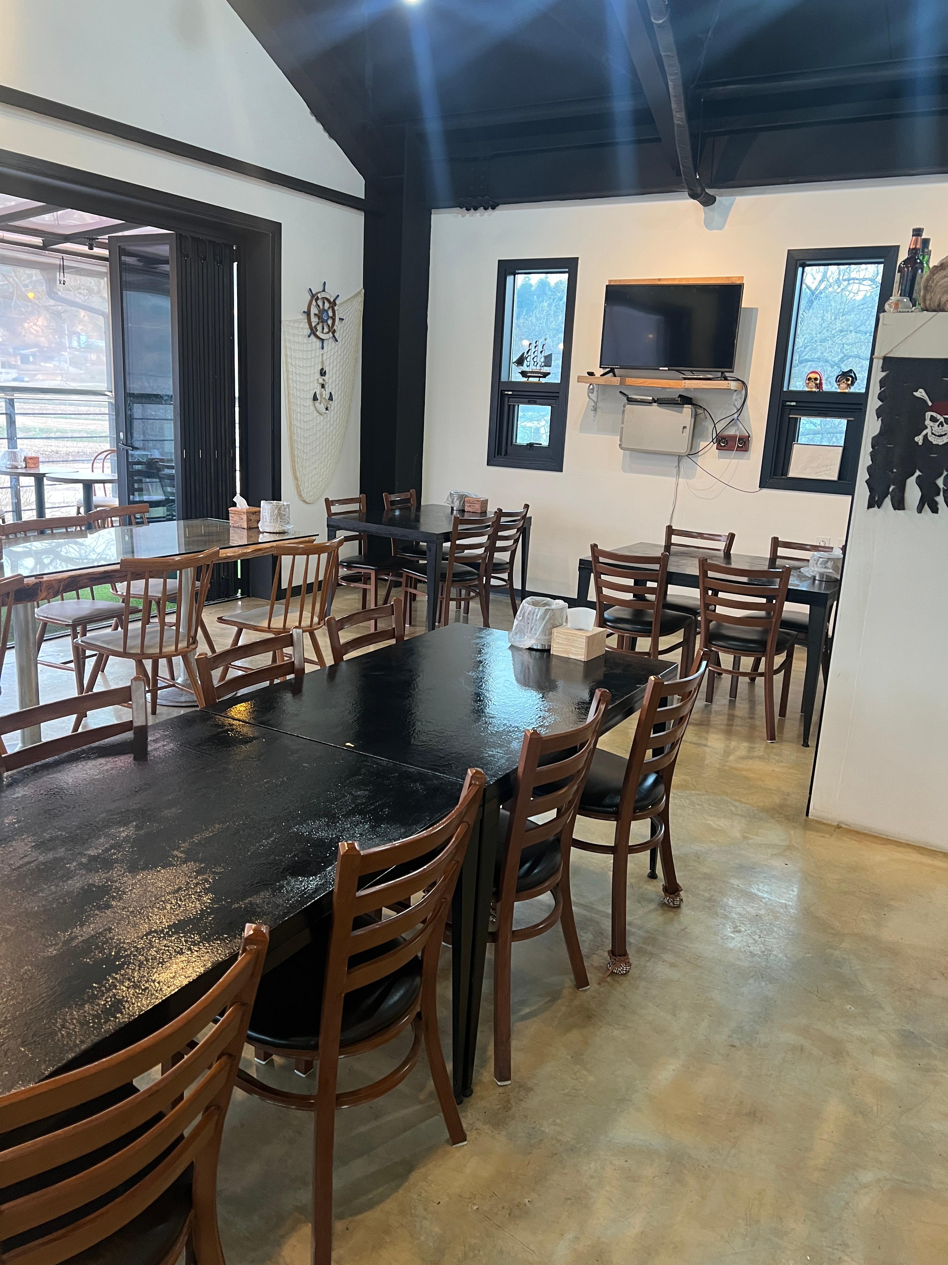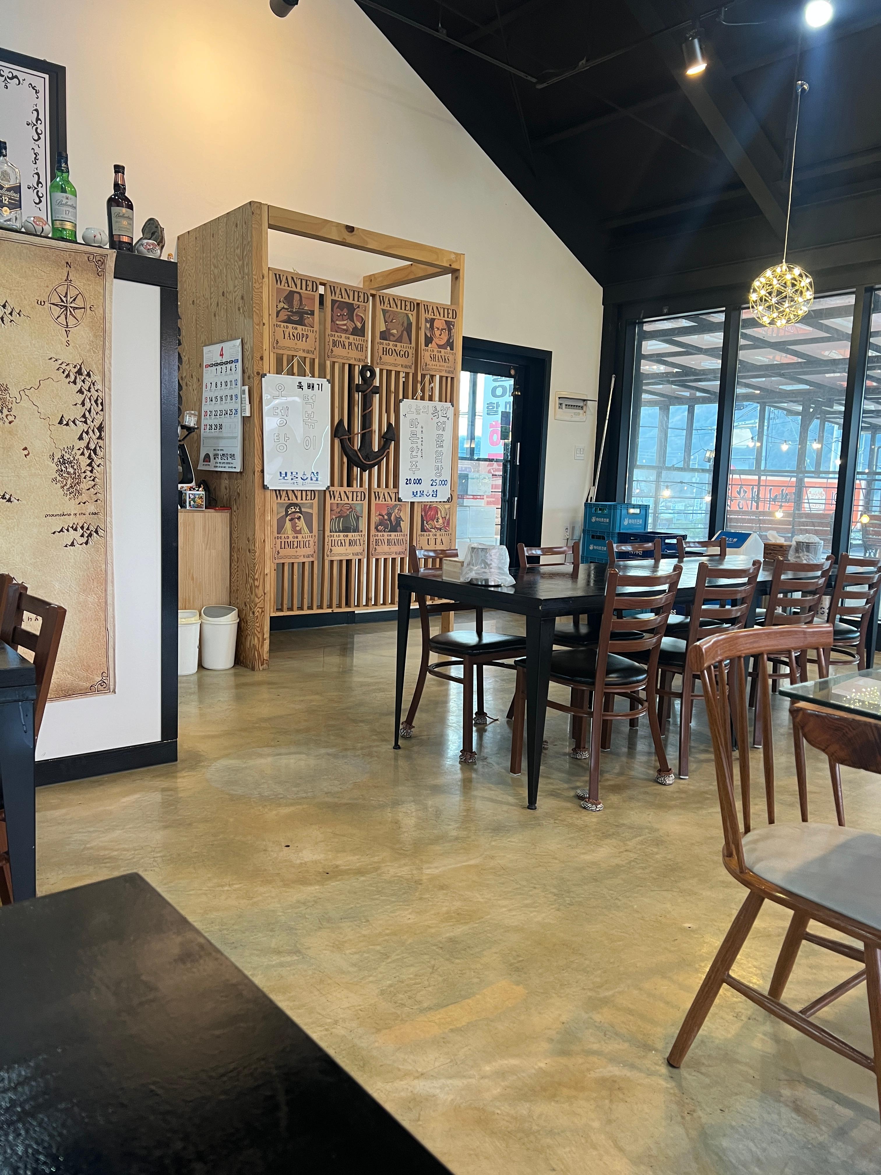 실내는 생각보다 꽤 넓고, 테이블 간격도 넉넉해서 여유로운 느낌이었어요. 해적 테마로 꾸며진 인테리어에, 은은한 조명이 켜진 창가 자리도 눈에 띄었고요. 바깥으로 보이는 풍경도 한적해서, 저녁에 조용히 맥주 한 잔 하기에도 딱 좋은 분위기였어요.