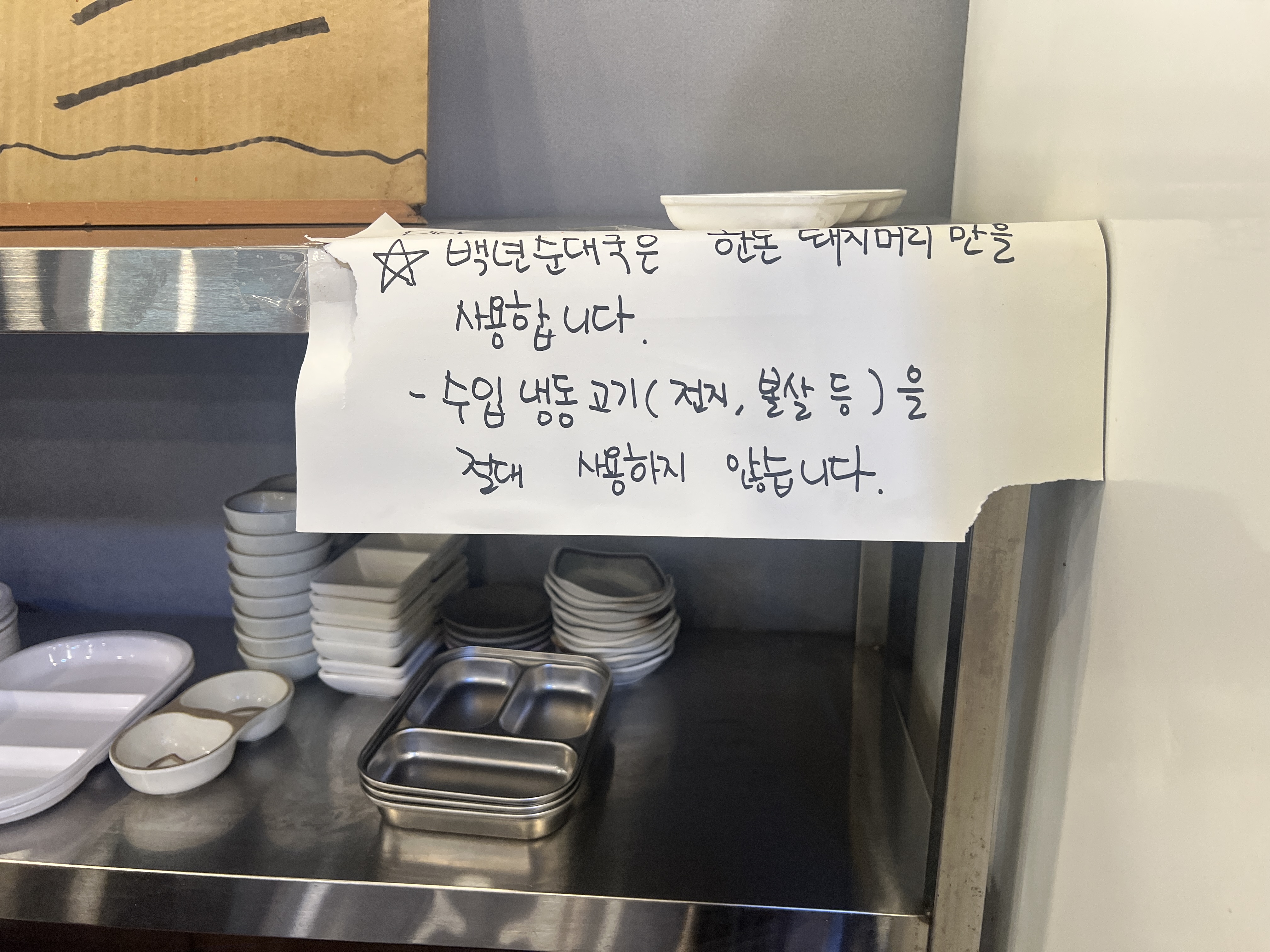 사장님의 자부심이 담긴 듯, 곳곳에는 ‘수입 냉동 고기 절대 사용하지 않음’, ‘한돈 대지머리만 사용’이라는 문구가 붙어 있었다. 그만큼 재료에 대한 신뢰와 자부심이 느껴졌고, 그게 맛으로도 그대로 전해졌다.