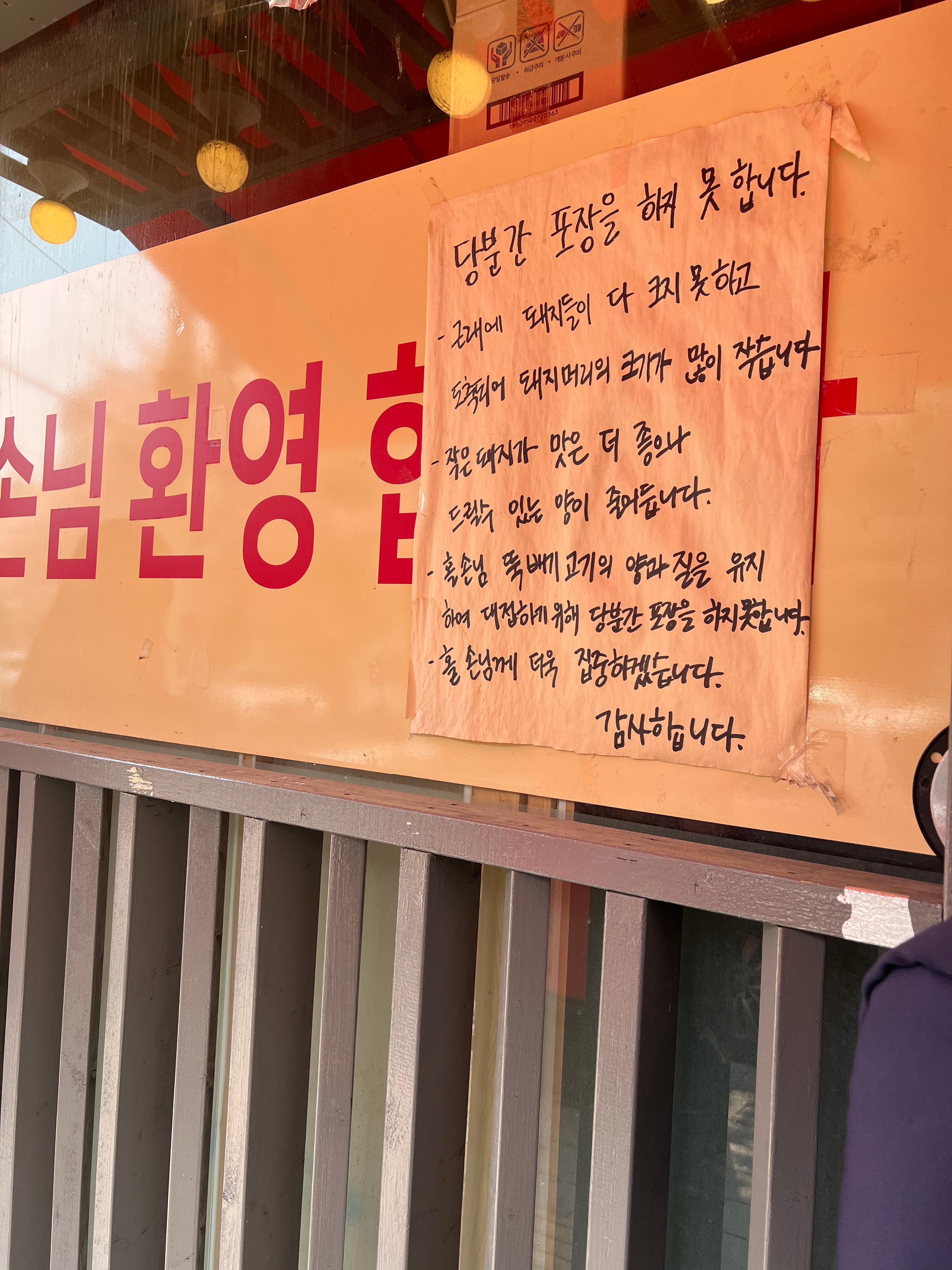 사장님의 자부심이 담긴 듯, 곳곳에는 ‘수입 냉동 고기 절대 사용하지 않음’, ‘한돈 대지머리만 사용’이라는 문구가 붙어 있었다. 그만큼 재료에 대한 신뢰와 자부심이 느껴졌고, 그게 맛으로도 그대로 전해졌다.