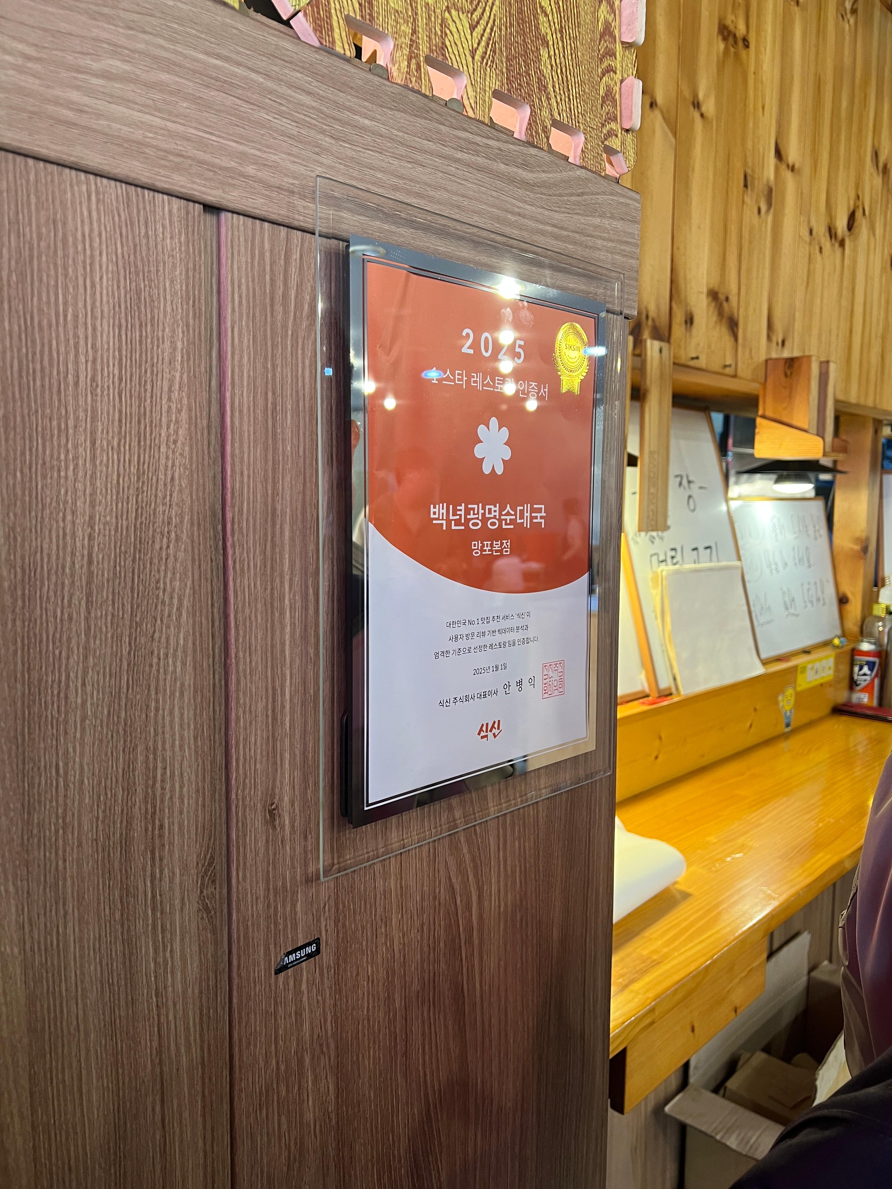 도착했을 때 이미 10명 넘는 사람들이 줄을 서 있었고, 문을 열기도 전에 이 집의 인기를 실감할 수 있었다. 평일임에도 불구하고 이 정도라면, 주말은 말할 것도 없을 듯하다. 실제로 이곳은 **‘백년광명순대국’**이라는 이름처럼 오랜 시간 사랑받아 온 전통 있는 순대국집이다.
