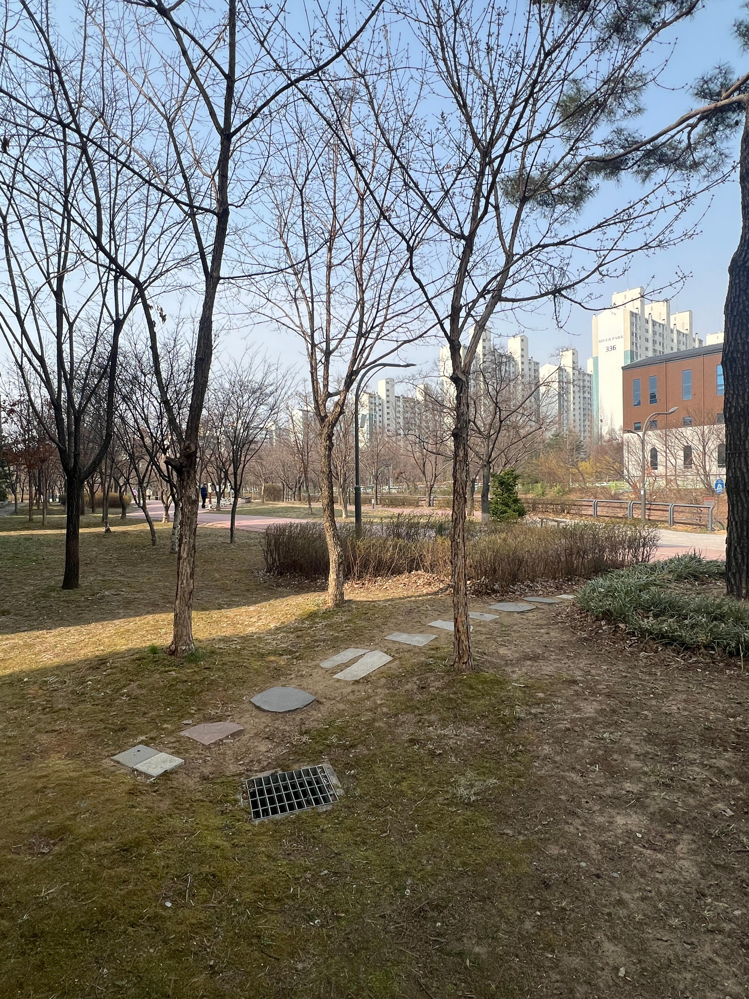 바로 옆은 신동수변공원, 산책로와 나무들로 둘러싸여 있어 도심 속 휴식처 느낌.