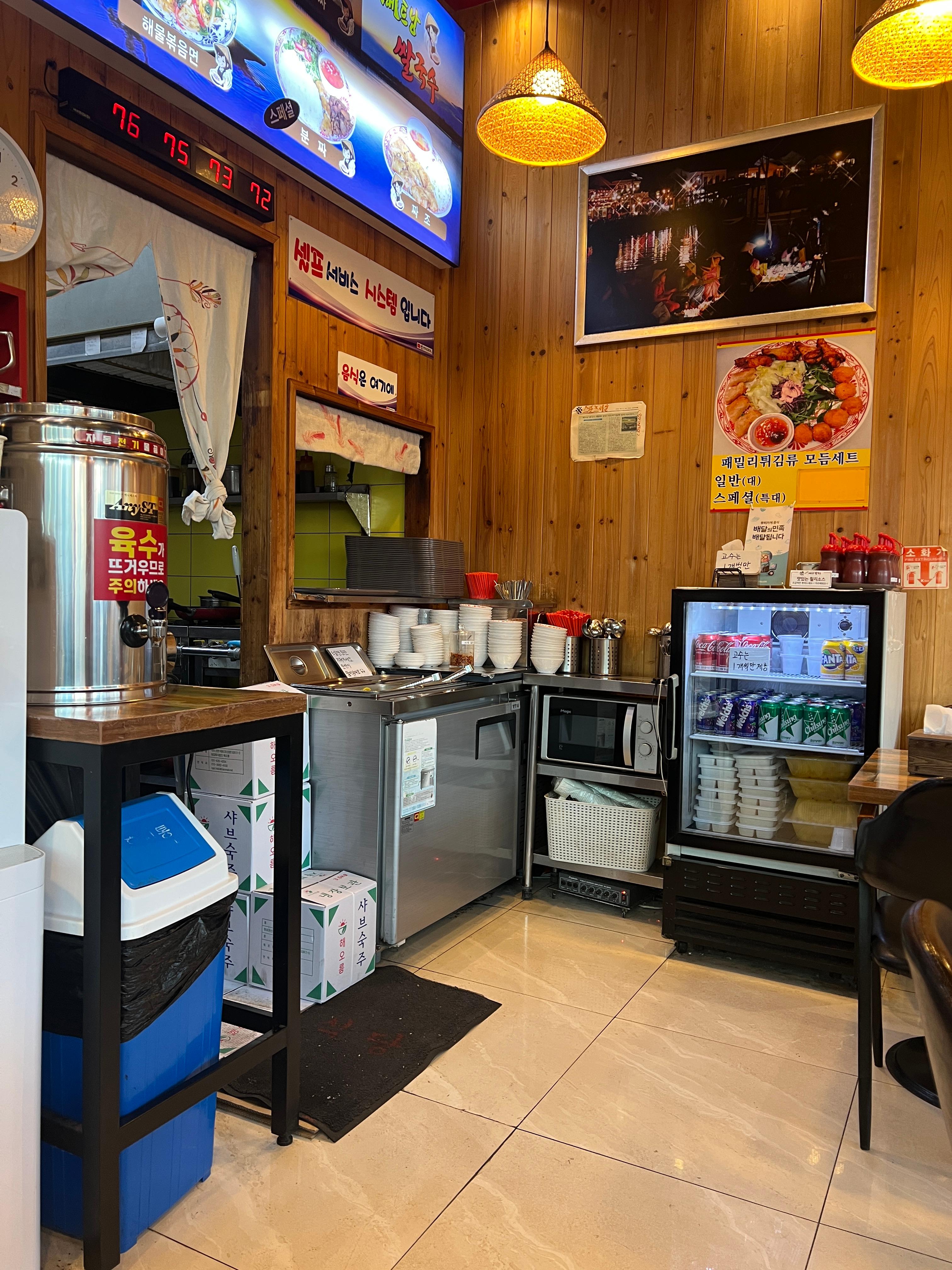 매장 내부는 아담한 크기였고, 셀프 코너에서 기본 반찬과 육수를 가져갈 수 있도록 되어 있었습니다.
