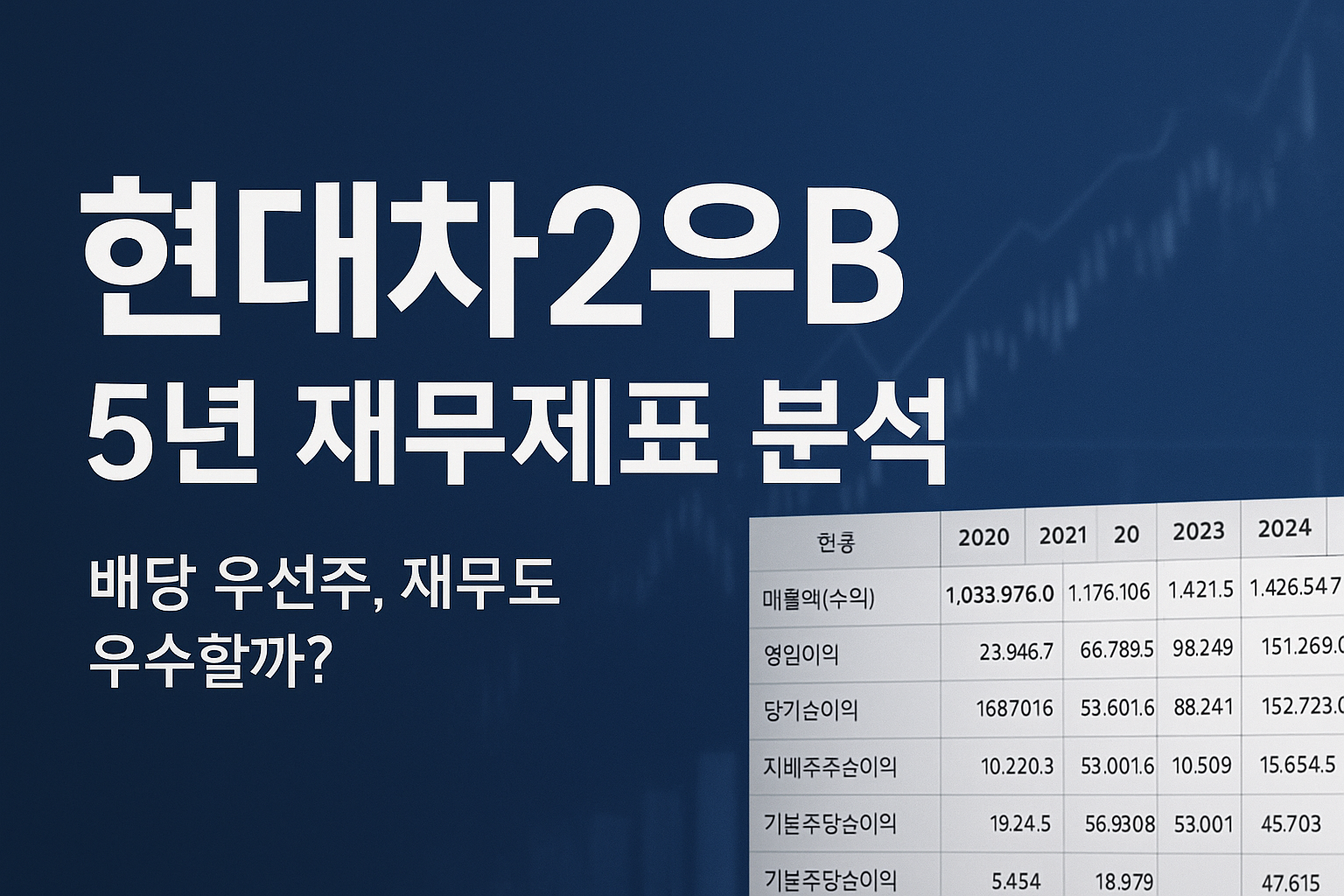 안녕하세요! 오늘은 안정적인 배당주로 잘 알려진 현대차2우B의 최근 5년간 재무제표를 기반으로 투자 관점에서 분석해 보려 합니다.