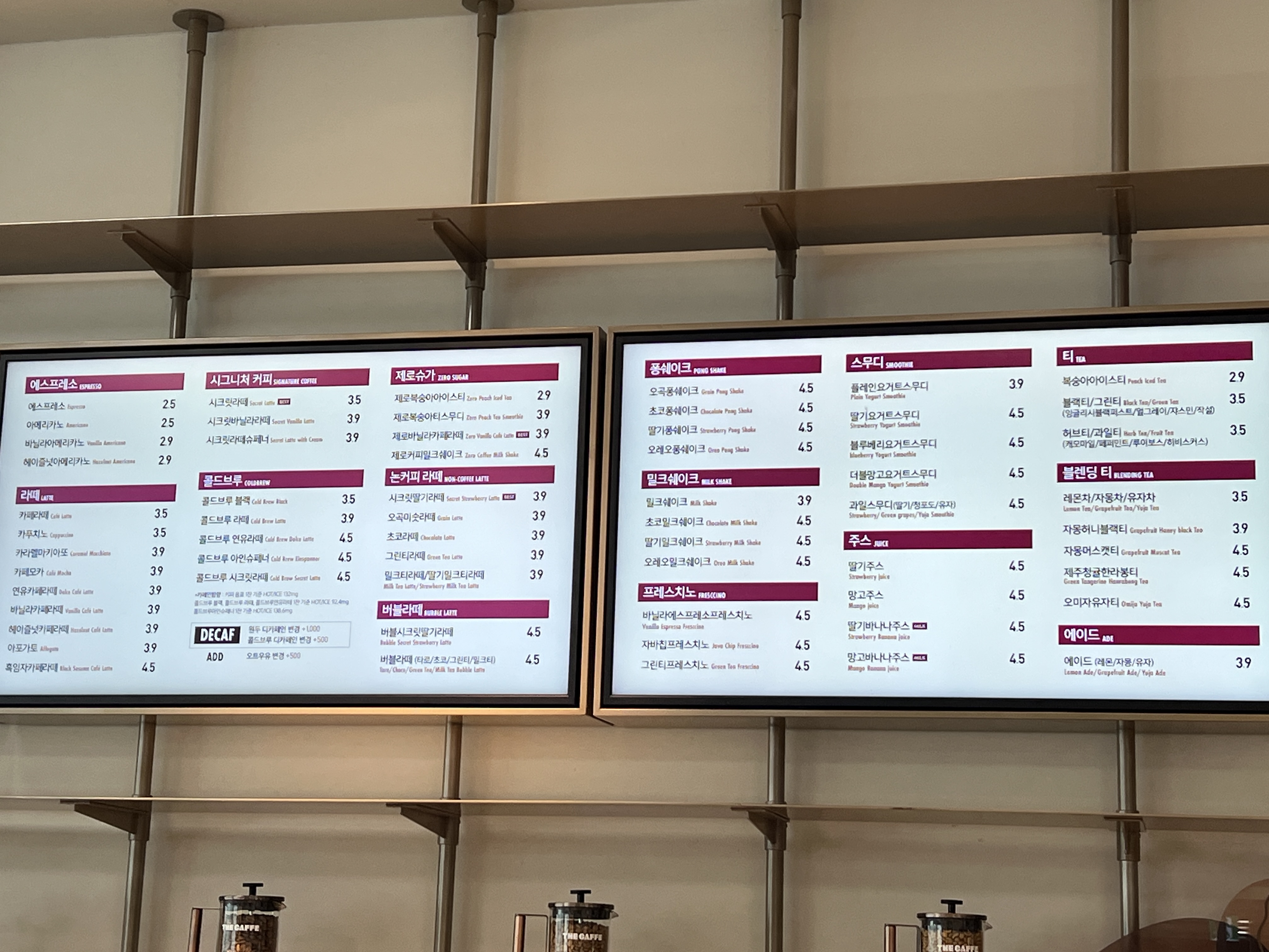 그리고 메뉴판을 보면 커피뿐 아니라 다양한 라떼, 프라페, 논카페인 메뉴까지 골고루 준비되어 있어 커피를 못 마시는 분들도 선택지가 넉넉해요.