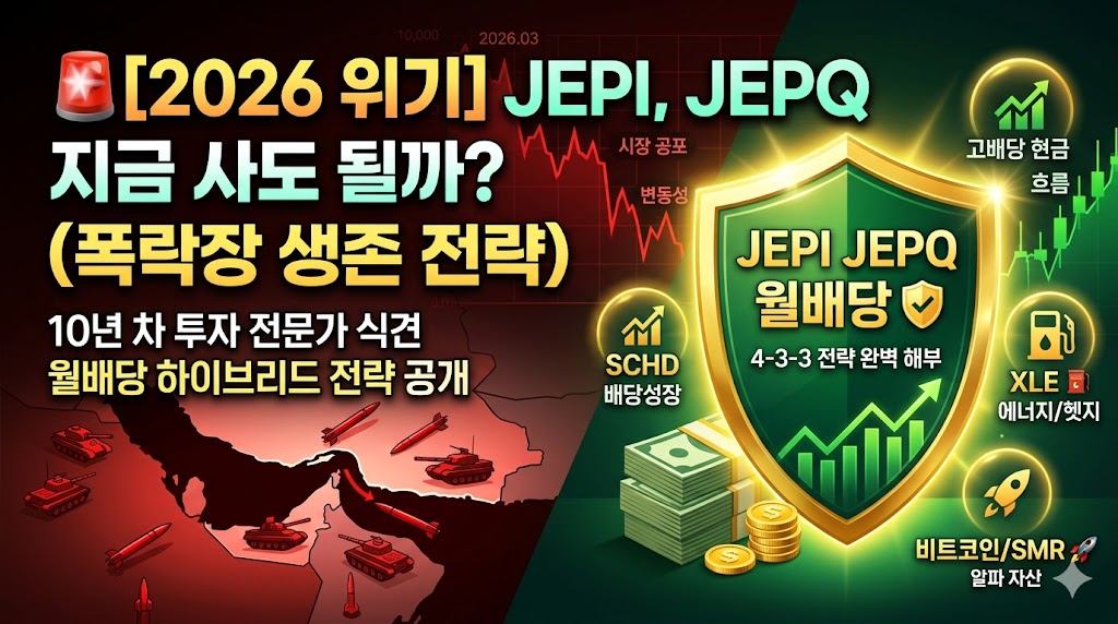 2026년의 이 험난한 지정학적 위기 속에서, JEPI와 JEPQ는 현재의 공포를 달러 현금으로 바꿔주는 훌륭한 무기가 맞습니다. 단, 이 무기는 튼튼한 방패인 SCHD, 그리고 상황을 역전시킬 창인 에너지/대체 자산(XLE, SMR 등)과 함께 사용될 때 비로소 완벽한 힘을 발휘합니다.