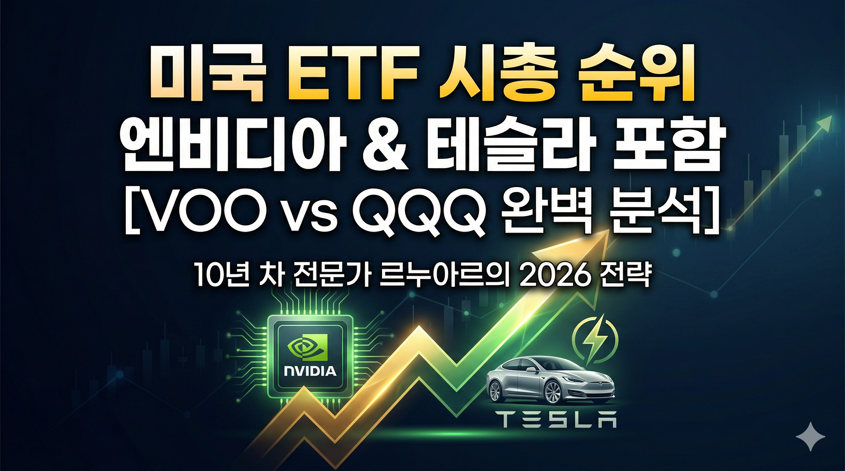 - 투자 포인트: 앞서 소개해 드린 S&P 500 기반의 ETF들(VOO, IVV, SPY)이 미국 경제 전반의 500개 기업에 분산 투자하는 든든한 '방어형 타자'라면, QQQ는 오직 기술 혁신과 파괴적 성장에만 풀스윙을 날리는 '강타자'입니다. 금융주를 제외한 나스닥 상위 100개 기업만을 콤팩트하게 담고 있기 때문에, 우리가 타겟팅하는 엔비디아와 테슬라의 비중이 S&P 500 ETF들보다 훨씬 높고 공격적으로 설정되어 있습니다. 실제로 2026년 3월 현재 QQQ 포트폴리오 내에서 엔비디아는 약 8.6%, 테슬라는 약 3.8% 안팎의 막대한 비중을 차지하며 지수의 상승을 하드캐리하고 있습니다. 연준의 금리 정책이나 전쟁 이슈로 인해 변동성은 S&P 500보다 크지만, AI 혁명과 자율주행 생태계의 폭발적인 수혜를 가장 빠르고 직관적으로 누리고 싶다면 QQQ는 포트폴리오에 반드시 편입해야 할 필수 엔진입니다. 과거 10년의 장기 수익률 백테스팅 결과가 증명하듯, 시장을 이기는 '초과 수익(Alpha)'은 언제나 QQQ의 몫이었습니다.