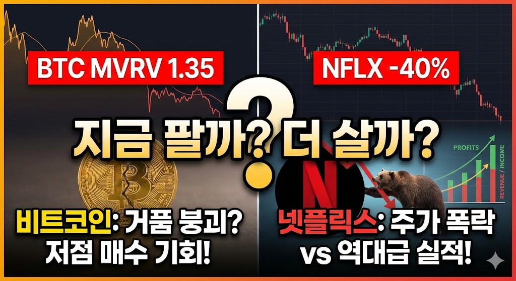 비트코인의 MVRV 1.35, 넷플릭스의 PER 33배. 숫자는 거짓말을 하지 않습니다. 대중이 뉴스 헤드라인만 보고 공포에 떨며 매도 버튼을 누를 때, 우리는 데이터를 보고 차분하게 매수 버튼을 누를 준비를 해야 합니다.