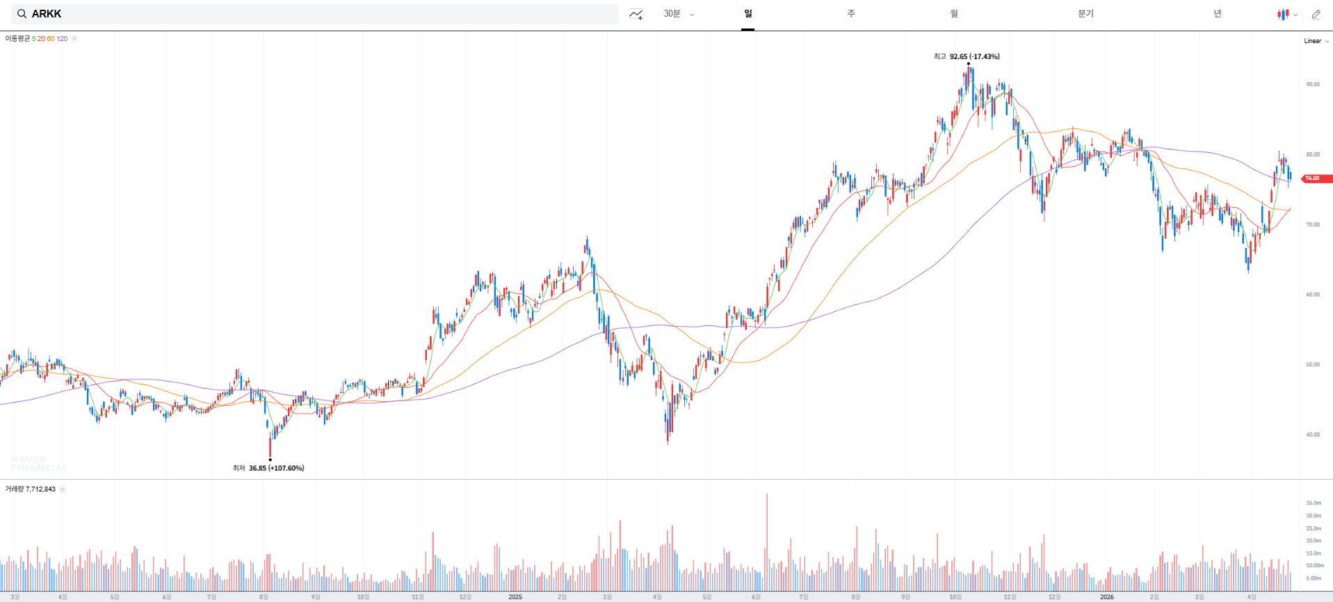 차트를 보면 ARKK ETF는 과거의 극심한 조정기를 거쳐 최저점인 36.85달러를 찍고 강력한 반등을 시작했습니다. 현재 주가는 76.50달러 선에서 형성되어 있는데, 이는 저점 대비 무려 **107.60%**나 상승한 수치입니다. 주요 이동평균선들이 정배열로 돌아서기 시작했으며, 120일 이평선(보라색)이 주가를 단단하게 받쳐주는 지지선 역할을 하고 있습니다.