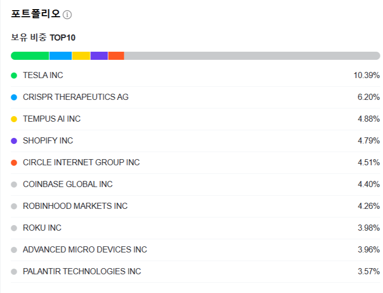 포트폴리오 상위권에는 유전자 편집 기술의 선구자인 **CRISPR THERAPEUTICS AG(6.20%)**와 AI 기반 정밀 의료 기업인 **TEMPUS AI INC(4.88%)**가 포진해 있습니다. 이는 ARKK ETF가 단순히 IT 하이테크에만 머물지 않고 인류의 수명을 연장하는 생명공학 혁신에도 깊이 관여하고 있음을 보여줍니다.