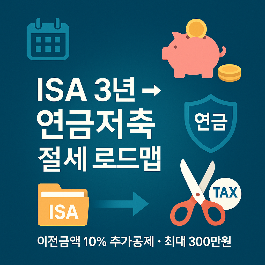 - 목표: ISA 3년 운용 후 연금계좌로 이전해 **추가 세액공제(이전금액의 10%, 최대 300만 원 한도 × 공제율)**까지 챙긴다.